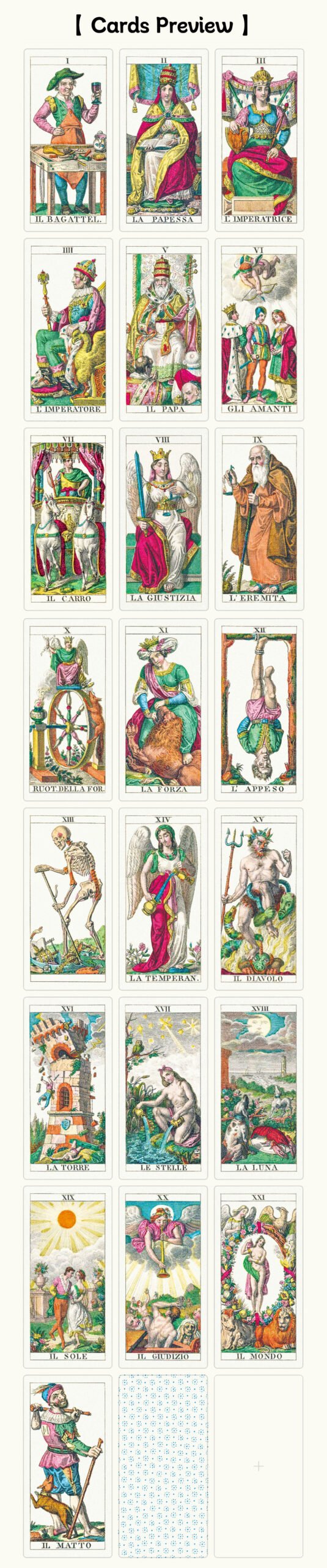 Ferdinando Gumppenberg, a German aristocrat and publisher, introduced to Milan the advanced printing techniques and aesthetic tastes of Germany at the time, and combined them with the classic ‘Marseille style’ to create a classic deck unprecedented in the history of tarot.