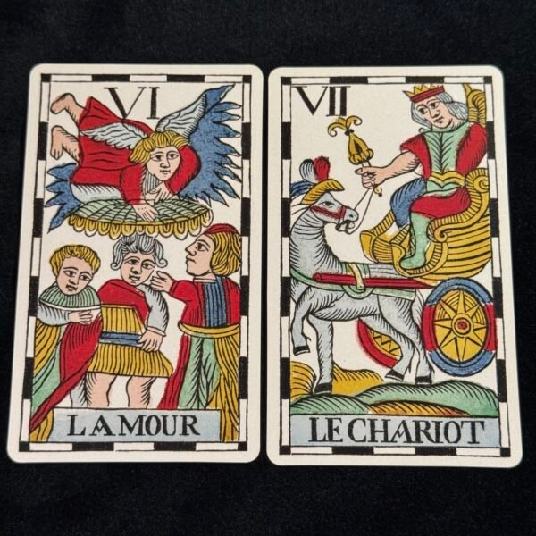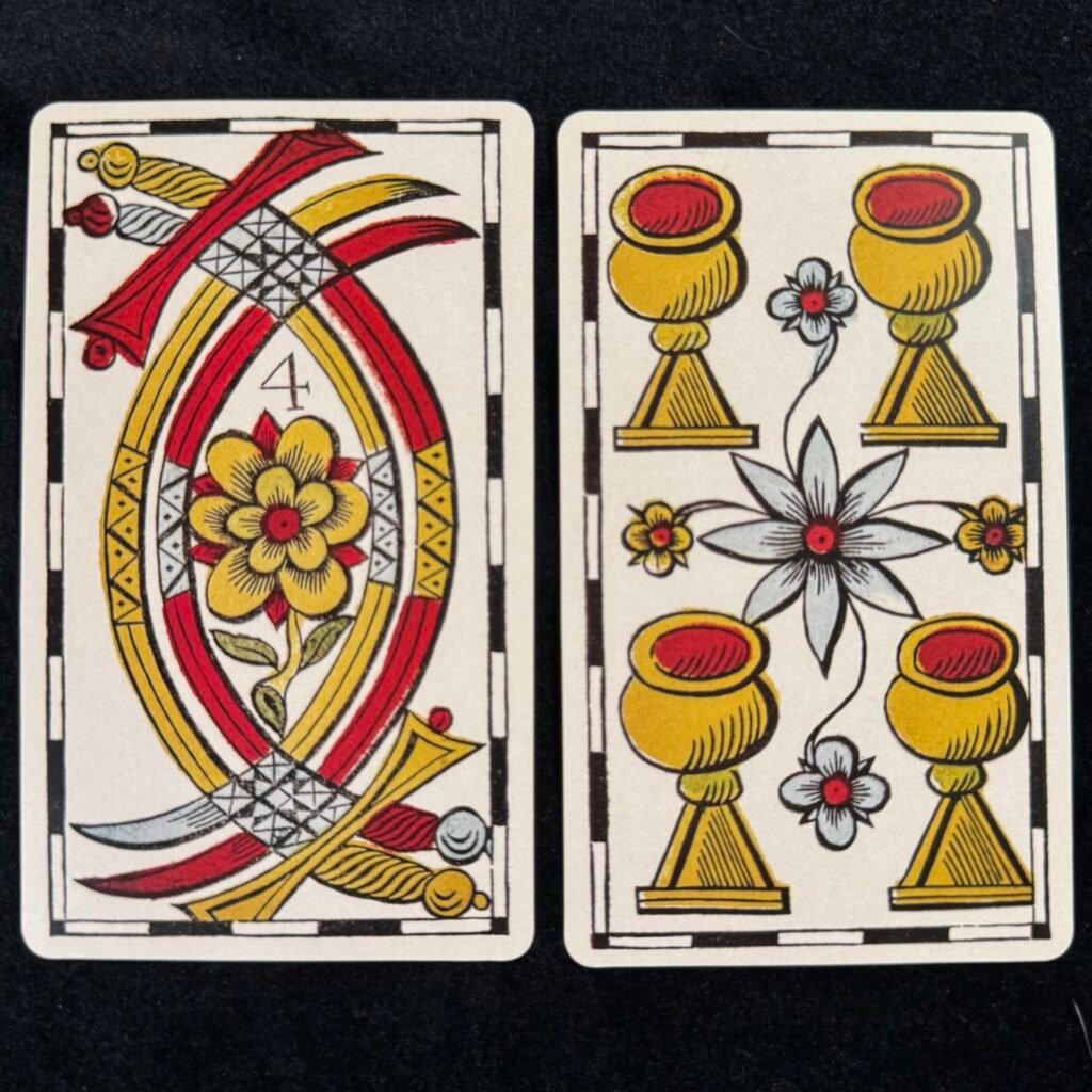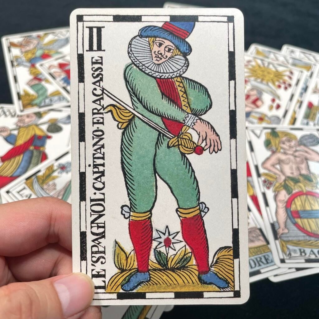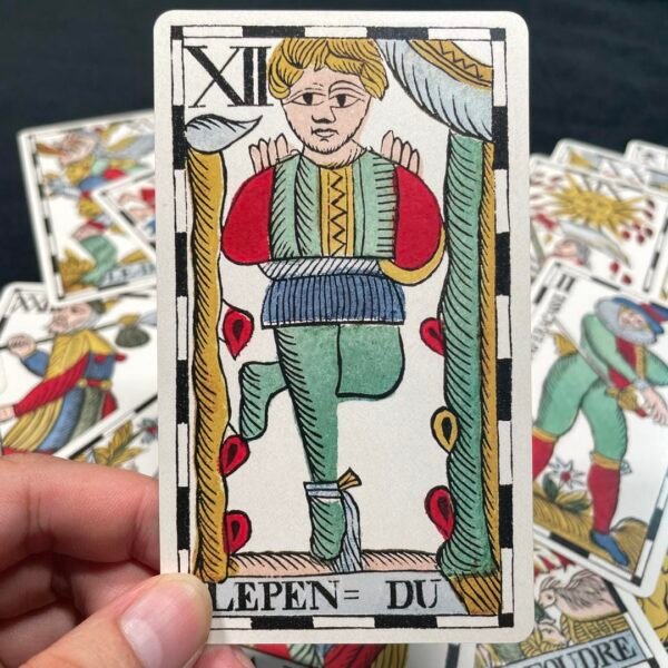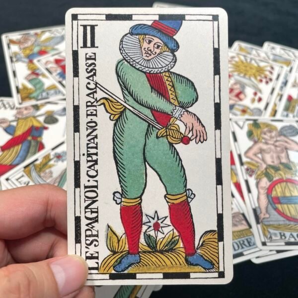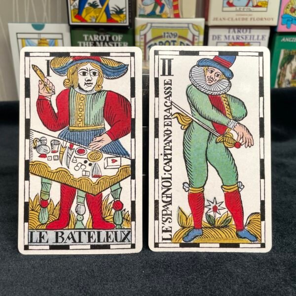 Historically referred to as “Cartes de Suisses,” the Belgian tarots share similarities with the Tarot de Marseille.This deck embodies a fascinating hybrid pattern, blending features from both the Bologna-like Italian tarot and the Tarot de Marseille, reflecting their geographical overlap in the 17th century.