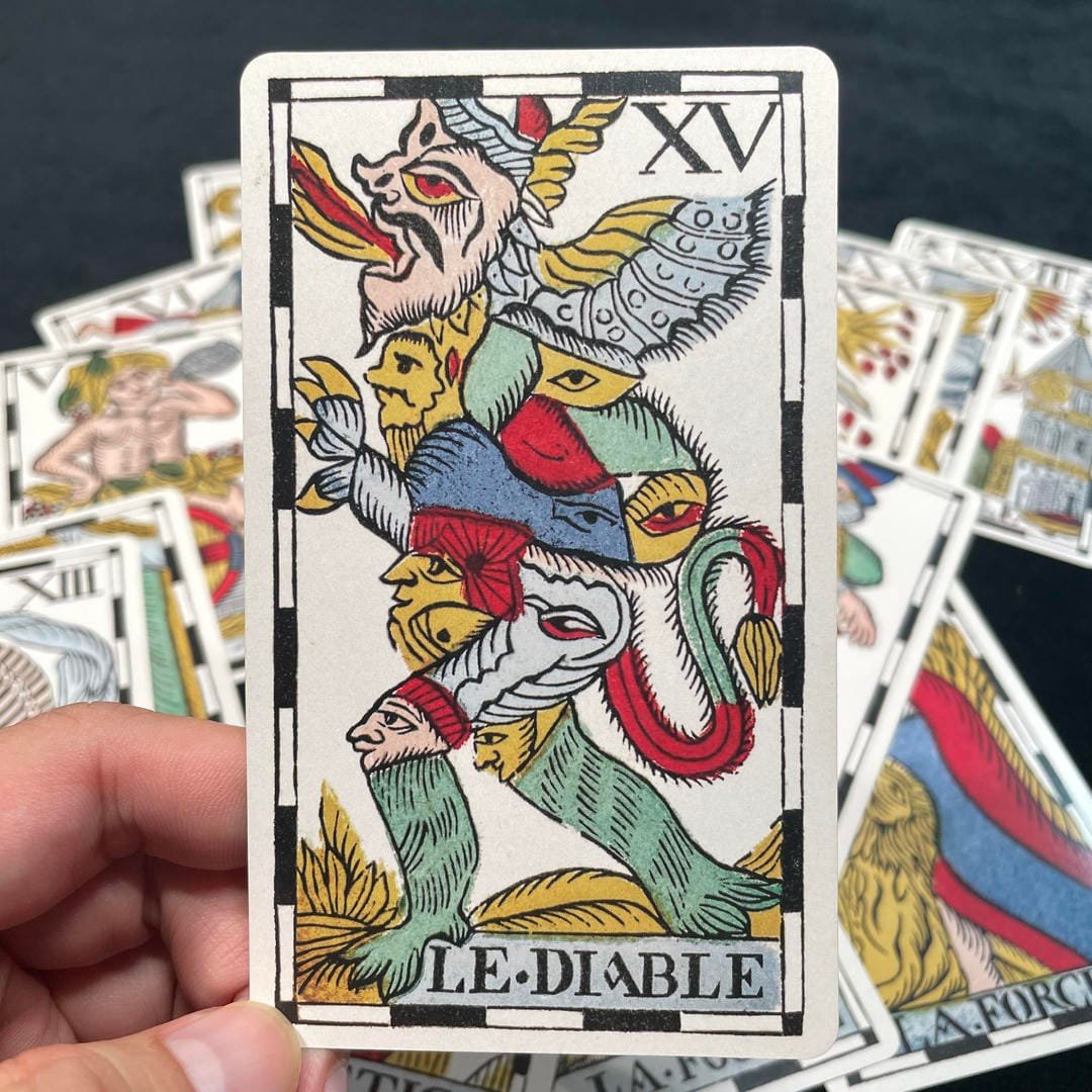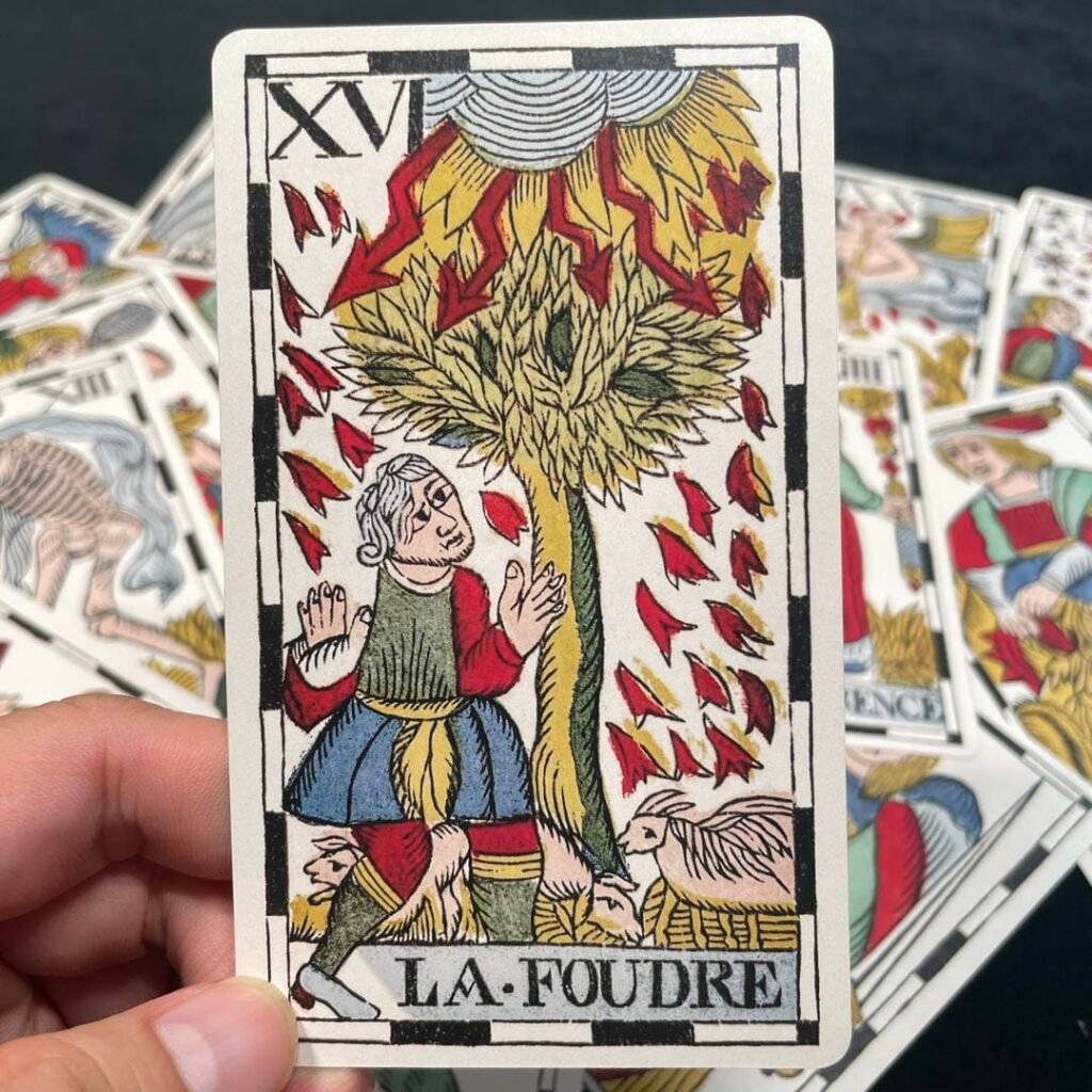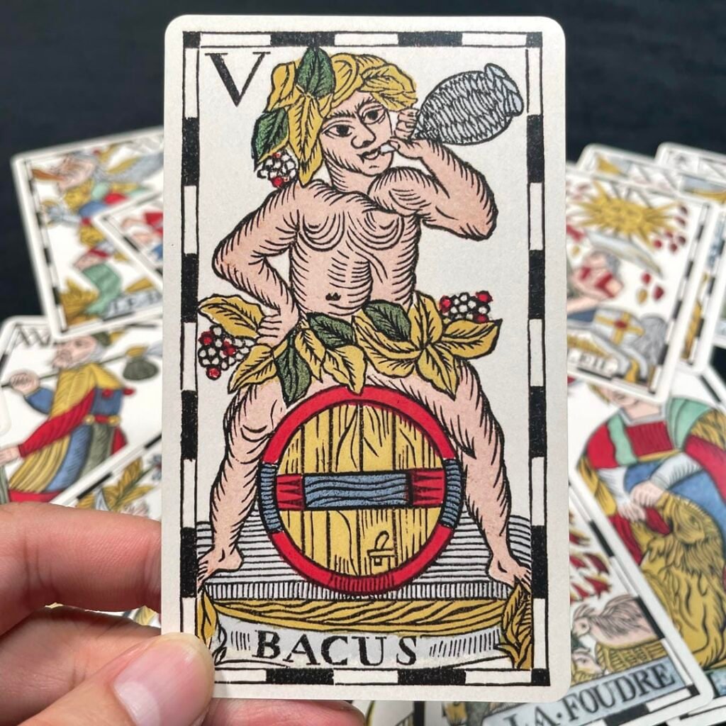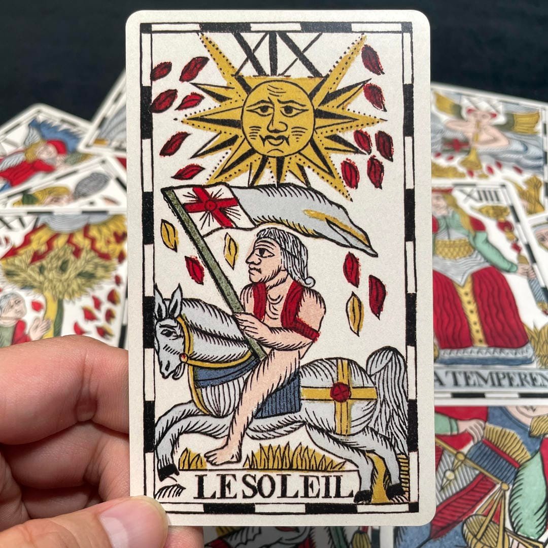 The trumps, for their part, are presented in an ancient style very different from that of the Tarot of Marseilles, the Pope and Popess have been replaced by the lively figures of “Bacchus” and the “Spanish Captain Fracasse” from the Commedia dell’arte.the head of the hanged man is turned upwards, the high tower is transformed into a lightning bolt, Temperance, the Devil, the Stars, the Moon, and the Sun, are presented in an entirely different style, and it is said that A. E. Waite and Pamela Colman Smith took reference from the Sun card of the deck in designing of Rider–Waite Tarot.