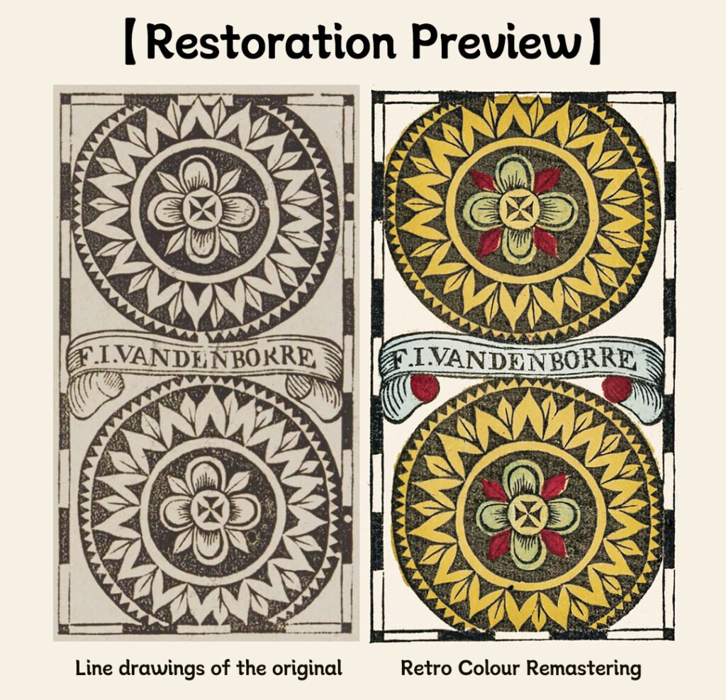 For example, we would fix the colours from the version with the colours first, and then overlay the restored version with the lines in the version with the colours, thus making the lines clearer.Comparing the line drawings that have survived so far, all the missing details in the original were filled in, while focusing on maintaining the original flavour of the original work to ensure that the final restoration result is clear and natural, bringing back the glory of this unique style of tarot deck.
