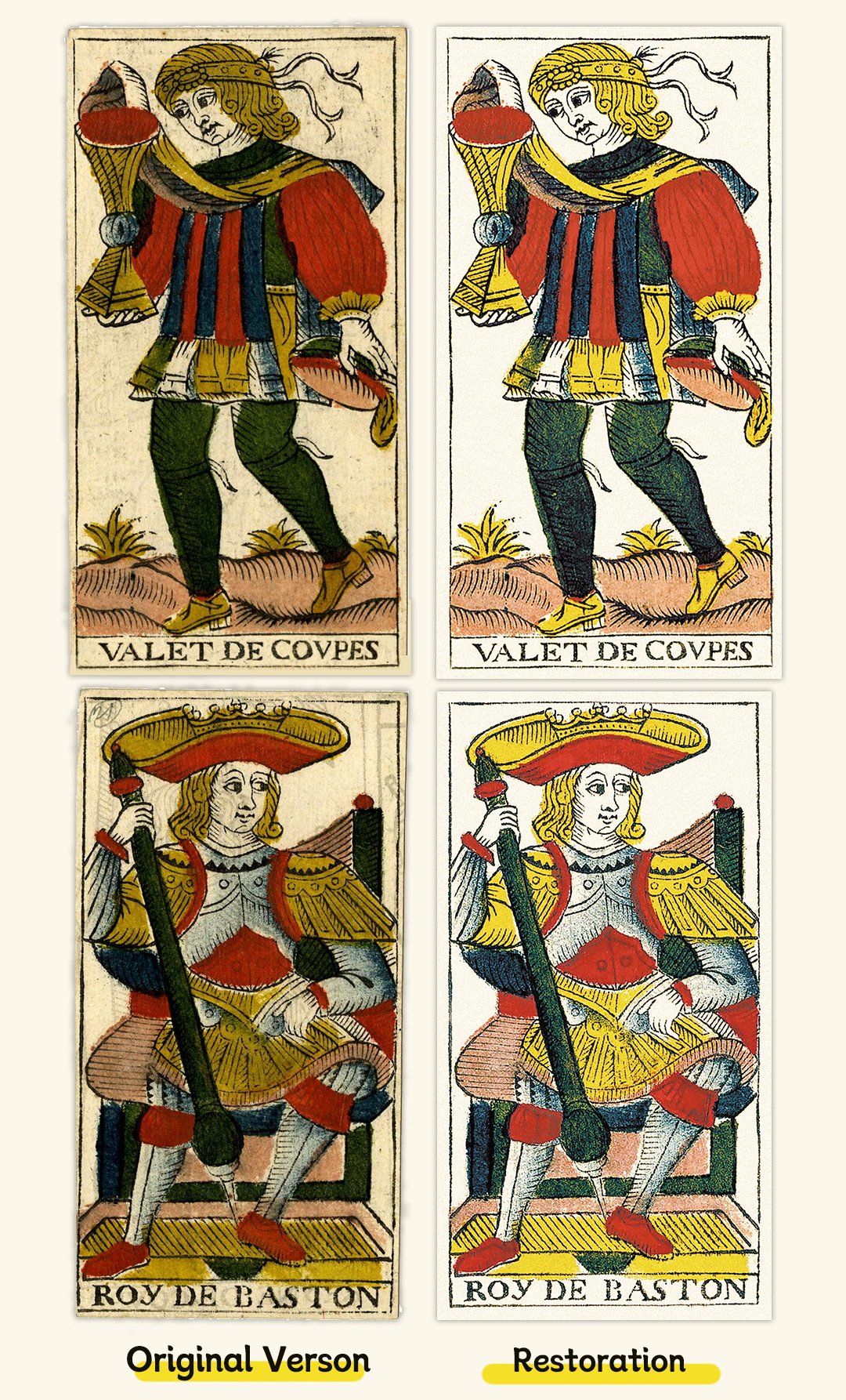 The edition of 1709, in particular, is a masterpiece of tarot card production and woodblock printmaking at the time. It accurately reproduces the most original symbolic images of the Tarot cards, with antique and delicate brushstrokes, truly restoring the charm of the Tarot cards.