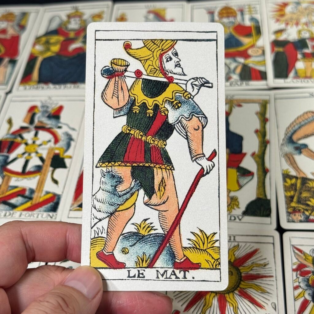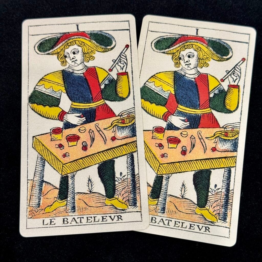 The original has a red fill in the hole formed between the Le Bateleur’s right hands, while other Marseille Tarot versions do not have this detail, which is corrected here.