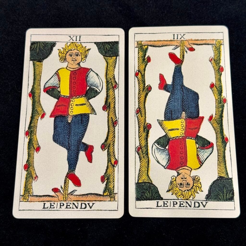 The original Hanged Man’s number is written as ‘IIX’, but here it is reversed in the same way as in the Flemish Tarot, resulting in ‘XII’.