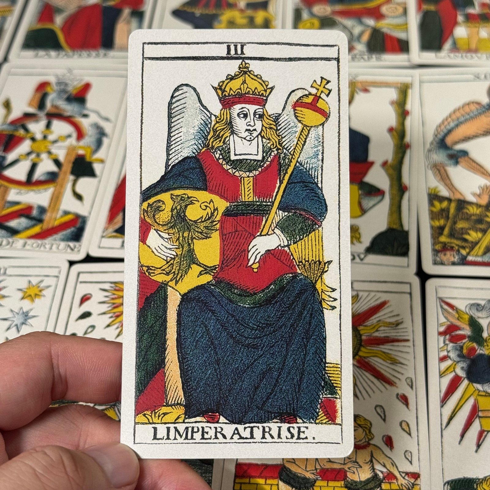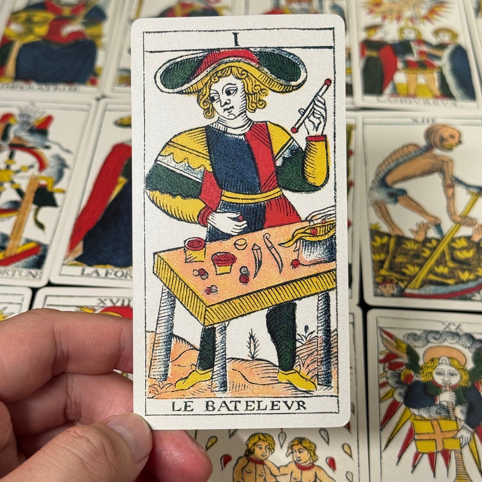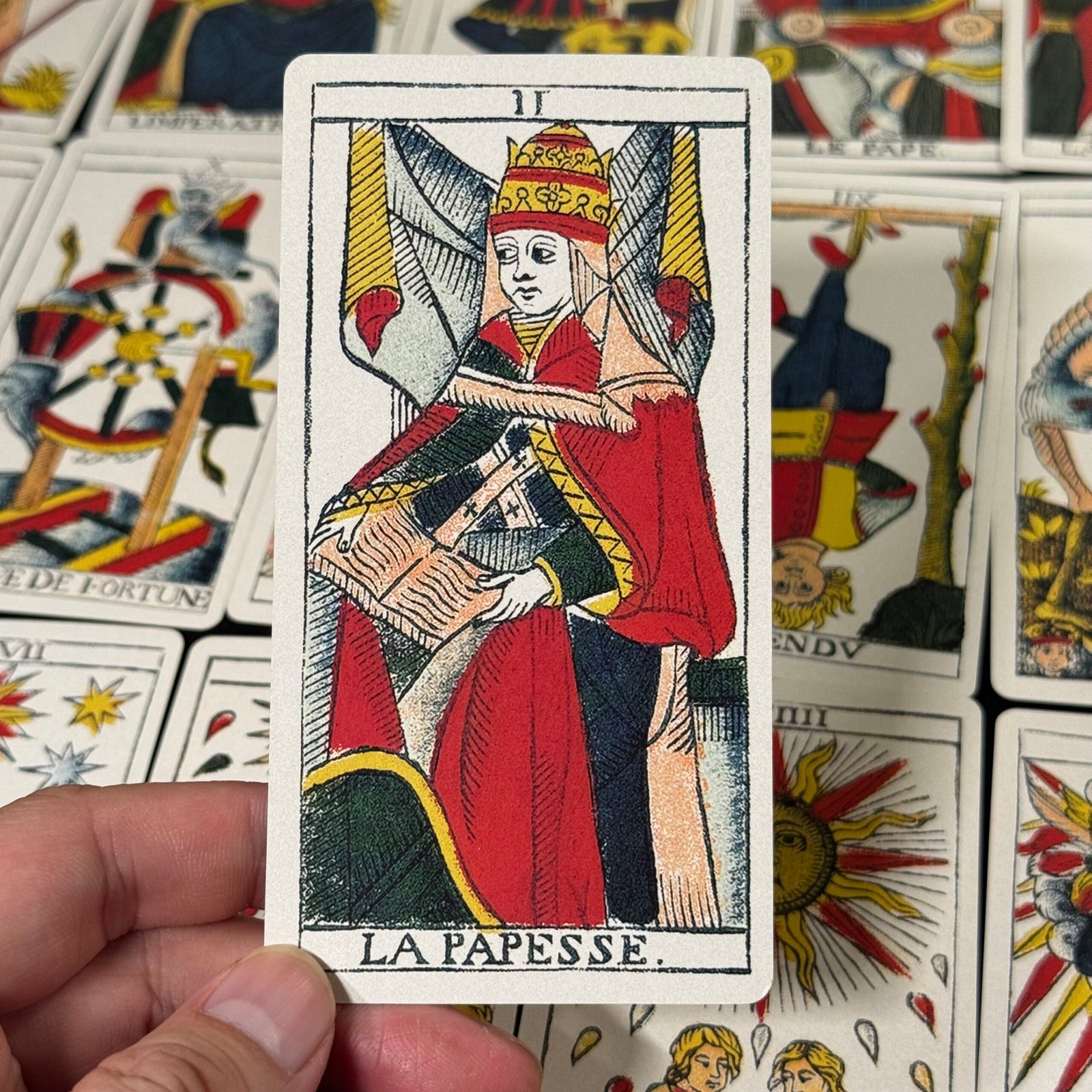 In the world of tarot cards, the Marseille tarot deck is undoubtedly the most unusual in terms of craftsmanship. Each face is hand–carved by the artisan on a wooden board, with fine, smooth lines and clear, vibrant outlines.